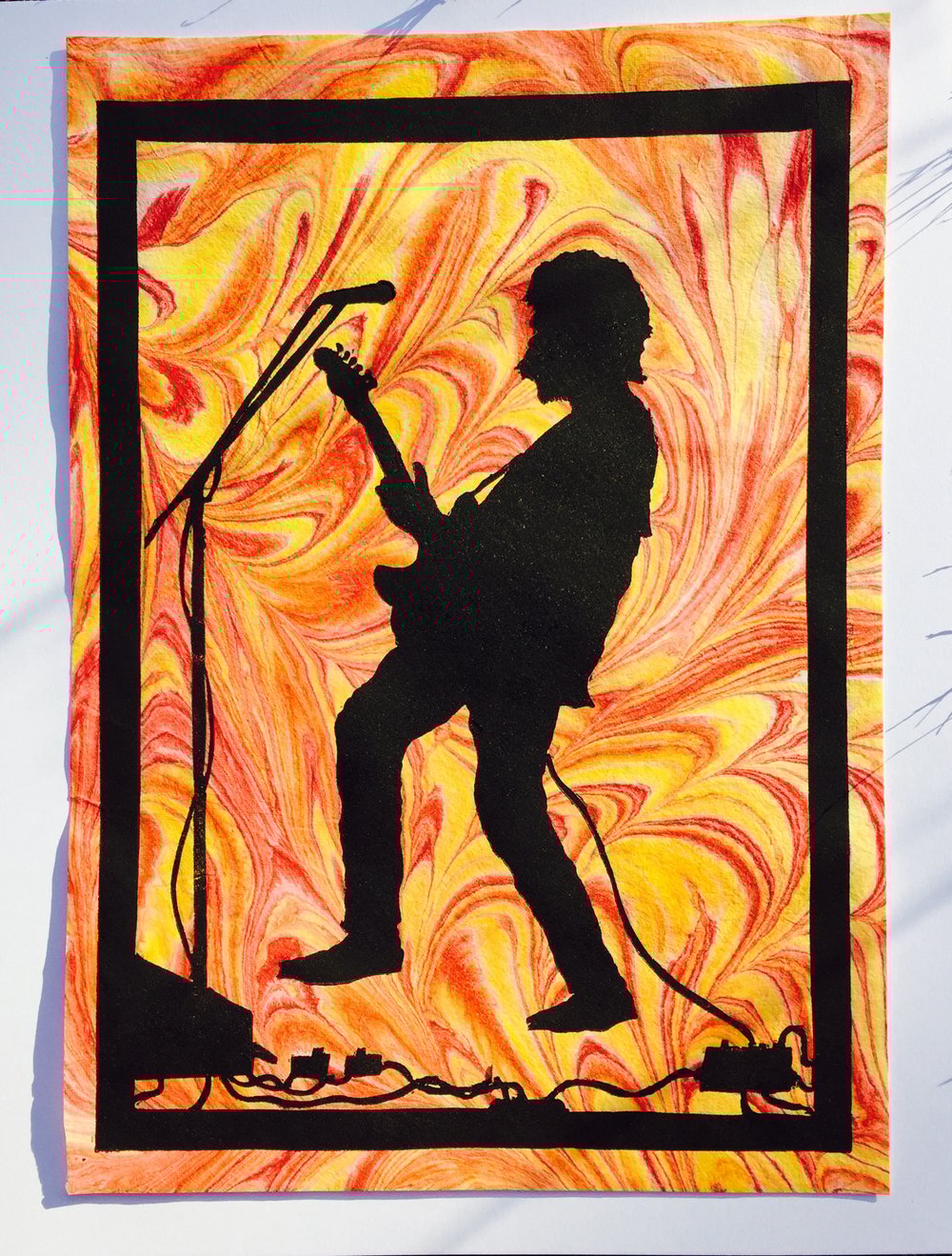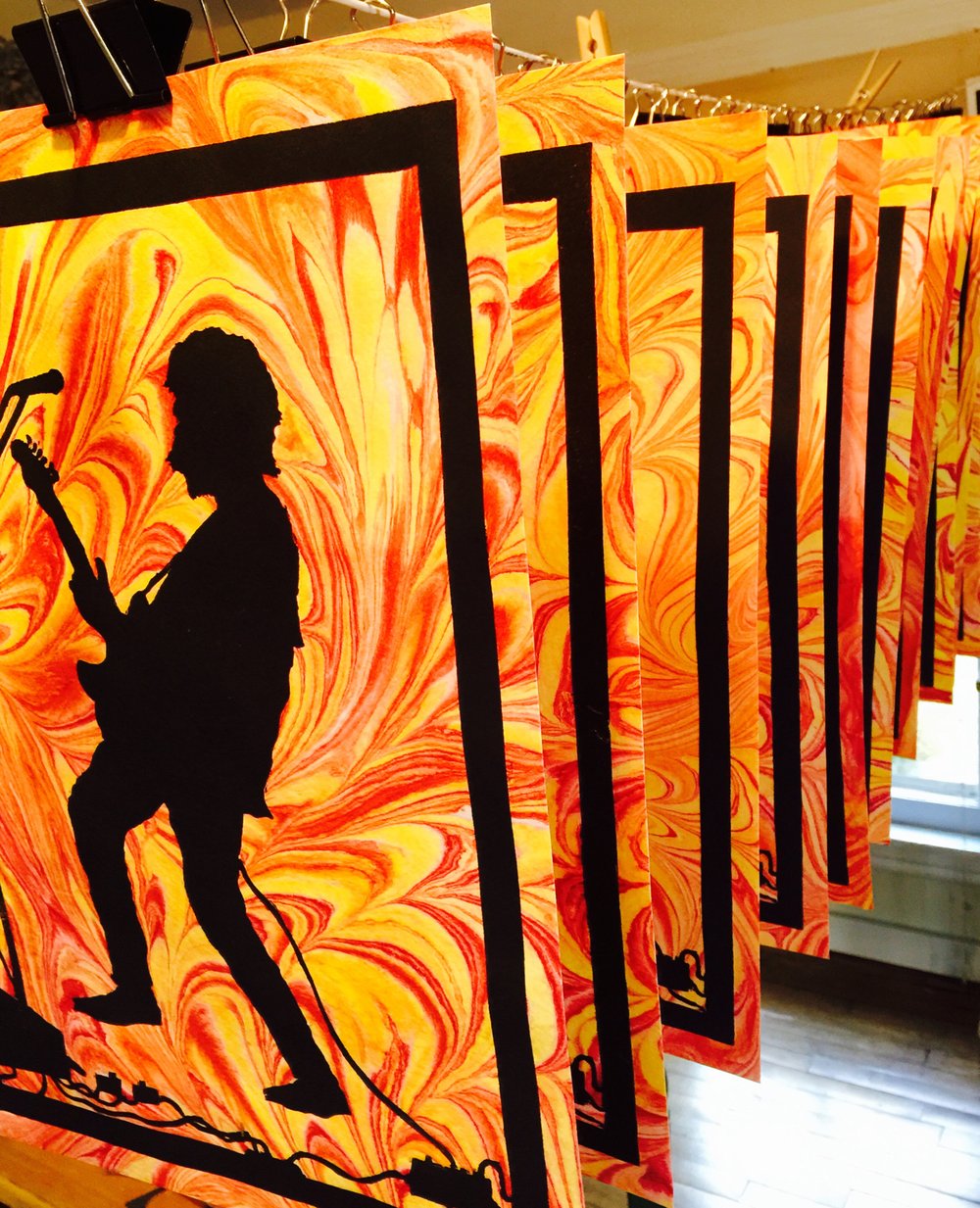 Second in a new series "Shadows of the Dead" which will present all Grateful Dead band members in Silhouette. Hand drawn, hand pressed and burnished linoleum block print. Printed on gorgeous, hand-made, exotic, marbled paper. Each print is signed marked AP. Print Sized 11 x 15 ish.