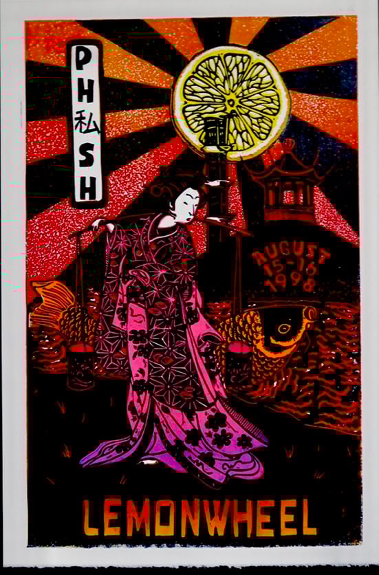 Phish Lemonwheel - hand printed 7 color linocut. linocut. Signed and numbered edition of 98 in each colorway. Line work edition of 20. Printed on Stonehenge paper with deckle edge. Prints measure 12.5 x 19. Please allow 2 weeks for shipping as they need time to dry properly.