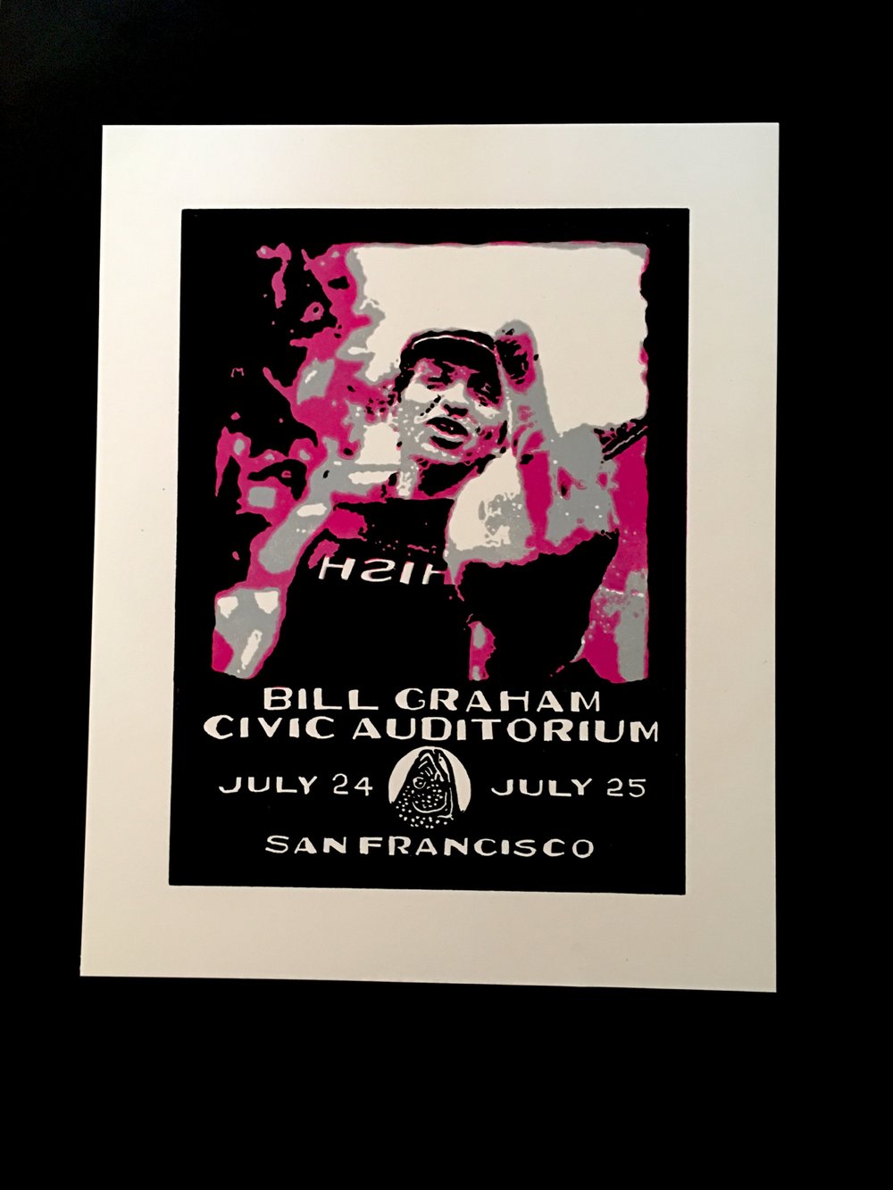 Hand Cut, and Hand Printed linoleum block print for Phish's shows at The Bill Graham Civic Auditorium in San Francisco. Printed on 100lb Fancy, French paper Comapny Cotton Candy Poptone Paper. Prints measure 12 x 15. Signed and numbered edition of 50. Variant edition of 25-only available as part of a set. This print pays homage to Bill Graham, an immigrant, whose mother sent him out of Germany to escape the Holoaust. A boy, who arrived here at the age of ten and lived in a foster home in the Bronx and became possibly the most successful concert promoter of all time. in addition to being a philanthropist and a guy who helped define the San Francisco sound...I could go on, but you get the point. **Prints will ship the first week of August.