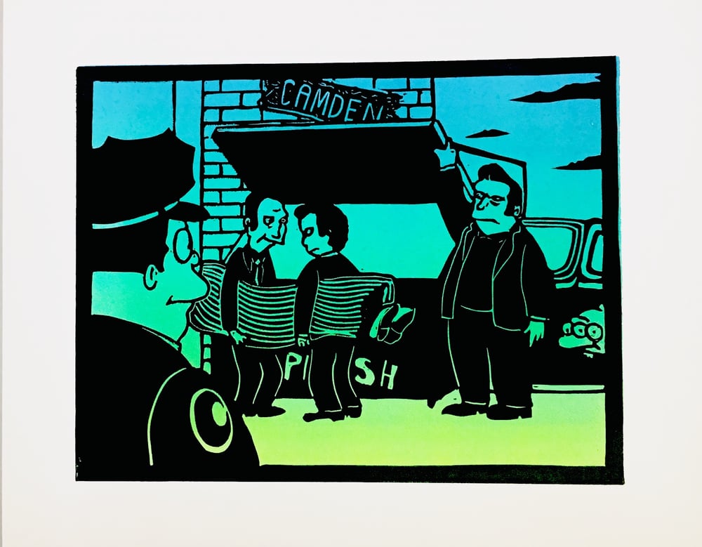 Hand Cut and hand printed Linocut. I think this is the 19th Simpsons themed print I have made over the years. Limited edition of 30 color prints and 10 basic Black prints. Signed and numbered.