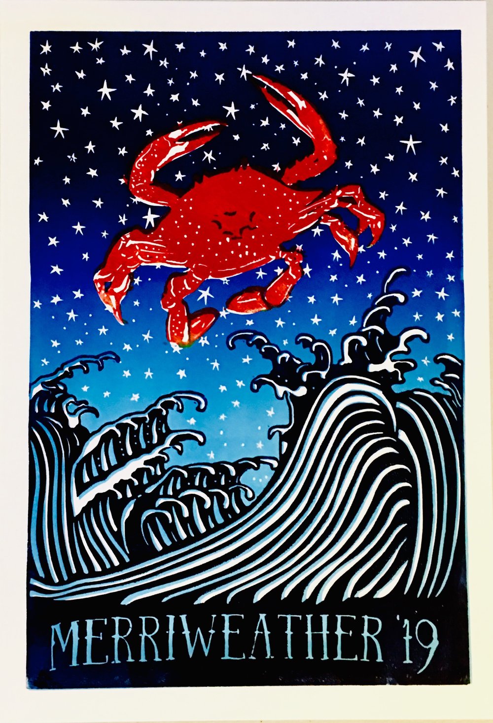 The crab returns- a nod to a poster Brian Bojo and I did a few years back. Last go round the crab was having his way with a fishing boat- this time the ocean is having it's way with the Crab. Hand cut, hand printed on fancy french paper. Edition of 30. Measures 12 x 16ish. Will not ship until after the MPP shows