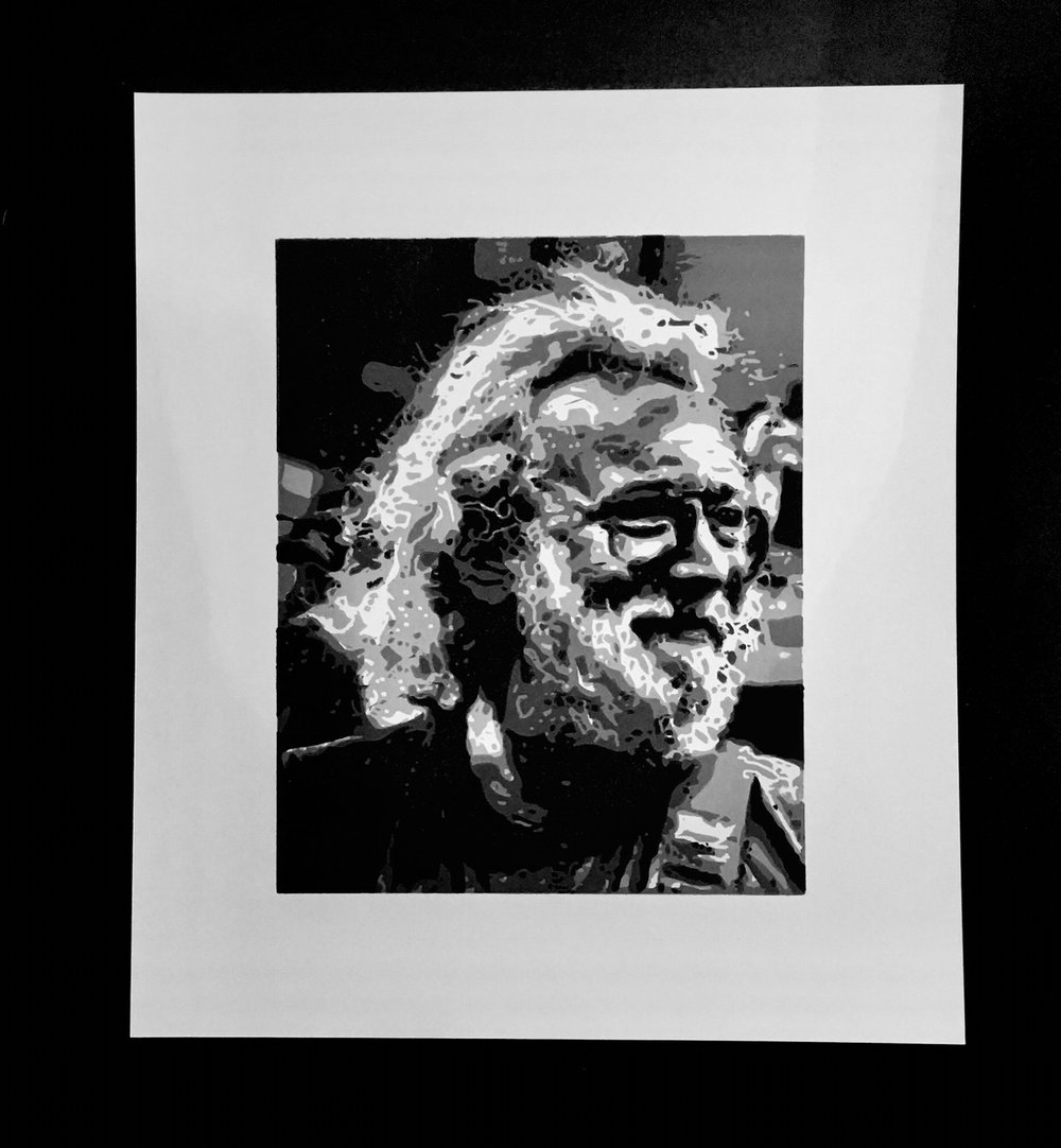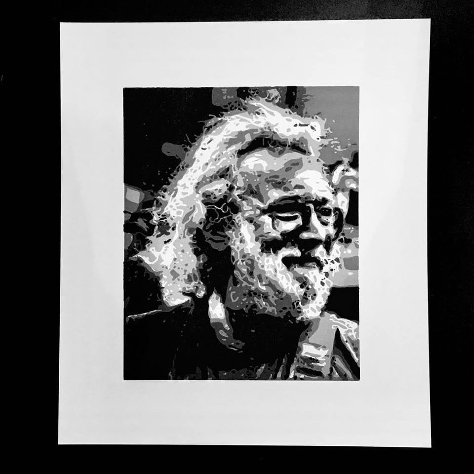 Hand cut, hand printed linoleum block printed portrait of Jerry Garcia. Signed and Numbered edition of 50 impressions in both the Purple and Greyscale Colorways. Printed on fancy 100lb French Paper. Prints measure 12.5 x 15ish. Prints will ship the second week of March- to allow for proper drying of the inks.
