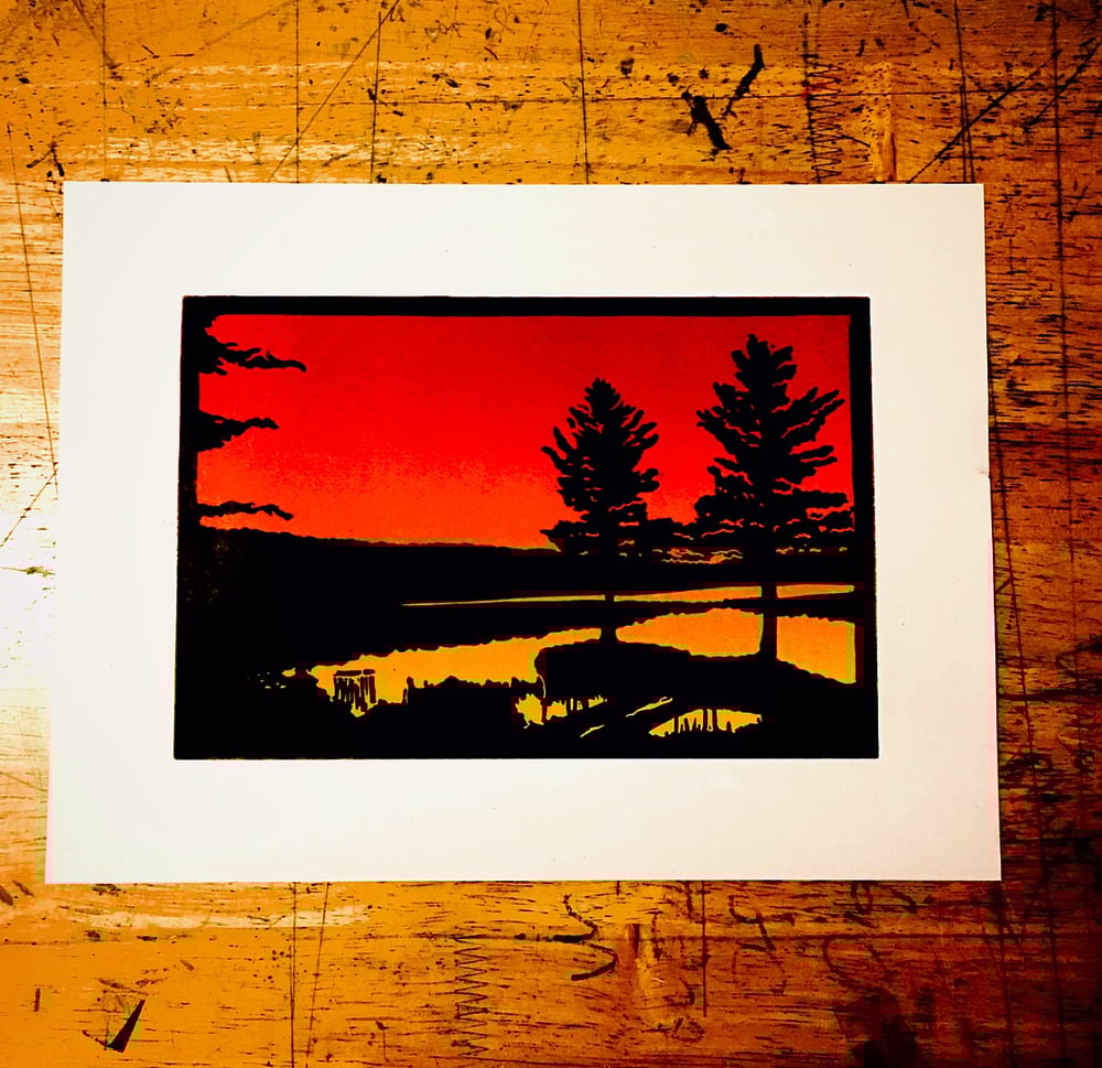 Hand printed, linoleum block print. Print measures 12x 9 and is printed on French paper. Artist Proof Edition.