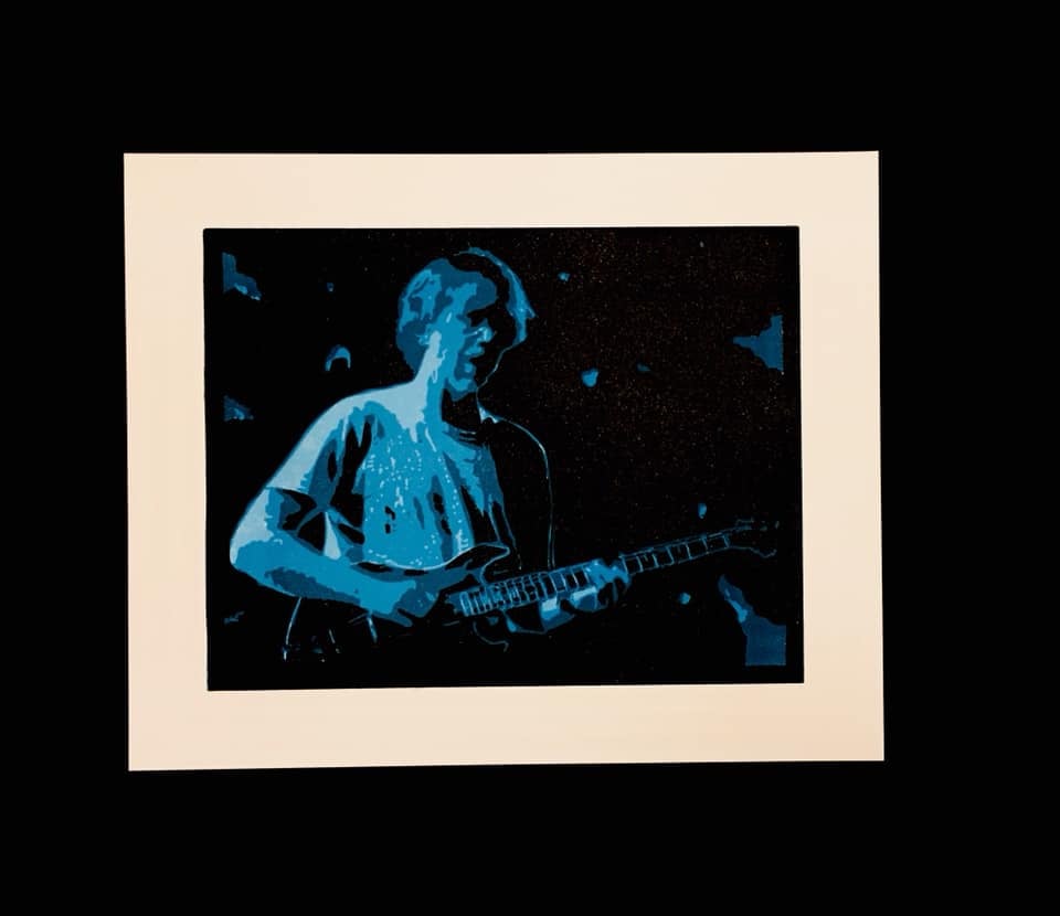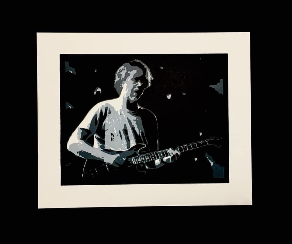 Hand cut, hand printed linoleum block print featuring Trey Anastasio at work- doing what he does best. This is the first print in a series that will feature each member of Phish at work. Available in three different colorways, Fire, Ice and Greyscale. Each print is signed and numbered and limited to 30 impressions (per colorway). Prints are hand printed on 100lb French Starch White Speckletone paper and measures 12x14.75 (approximately).
